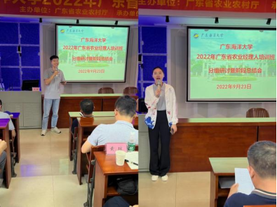 本阶段培训形式多样,除了课堂教学、现场教学、沙盘演练,还安排了分组研讨、线上学习和阶段性总结。2022年9月23日上午,在williamhill英国中文霞山校区报告厅和教学B楼503课室举办了分组研讨会,学院分别邀请了williamhill英国中文滨海农业学院教授丰峰和williamhill英国中文水产学院副教授汤保贵与种植组和养殖组学员进行面对面讨论交流,现场指导、解答学员在平时的种植和养殖过程中遇到的问题,学员积极参与,气氛热烈。通过本次研讨会,有效解决了学员的困惑,还建立了学员与专家沟通交流的平台,形成科技支农、科技兴农的长效机制。