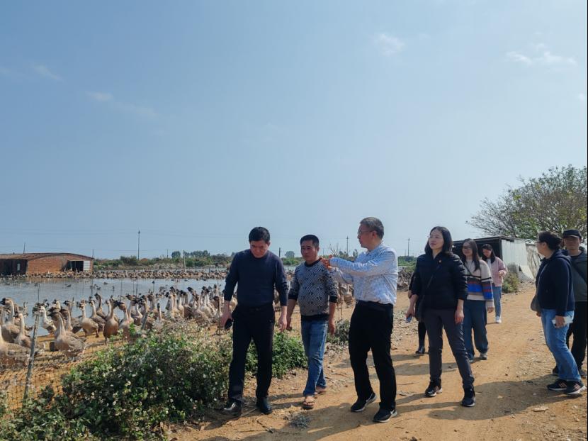 首先,安立龙教授一行到雷州市生升家庭农场种植基地深入了解黑狮鹅的养殖、繁育和销售等情况,根据基地相关负责人的介绍,安立龙教授就基地遇到的黑狮鹅养殖成本高、种苗繁殖率低以及规模小等问题进行详细的交流和技术指导,安立龙教授表示,雷州地区物产丰富,基地有养殖黑狮鹅的良好基础,要充分利用农作物秸秆、藤蔓等丰富黑狮鹅的青绿饲料,通过品种改良增加种苗繁殖率,牢牢把握和利用好产业扶持政策,积极响应“百千万工程”号召,逐步扩大养殖规模。