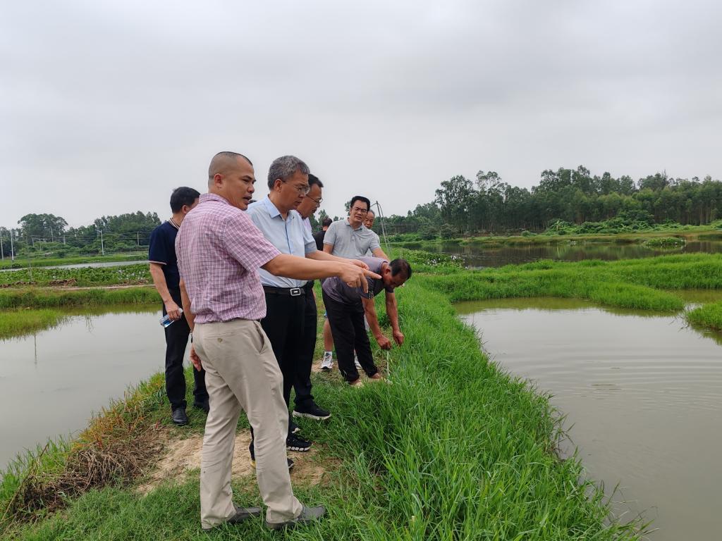 安立龙教授一行首先来到参加我校承办的2023年广东省农业经理人培训班学员林志文位于乾塘镇的稻虾综合种养基地,目前,该基地正在进行水稻和小龙虾共种养试验,据基地负责人林志文介绍,湛江地区小龙虾养殖面积小,但市场需求量较大,湛江地区常年温度较高,适合反季节养殖,由于小龙虾种苗原因,目前湛江反季节养殖规模不大。孙成波教授表示稻虾共种养是一种高效的生态养殖模式,稻田中的微生物、害虫为小龙虾提供饵料,而小龙虾的排泄物给水稻生长提供肥料,实现了“一水两用、一田两收、粮虾双赢”的种养效益,促进农业可持续发展,共种养模式中水稻和小龙虾产量提升是关键,并就小龙虾种苗、水质调控和反季节养殖营养控制等方面进行指导。黄永相副教授详细询问了目前稻虾共种养模式种植的水稻品种,就稻虾共种养水稻田间管理、土壤营养和水源保障等方面进行详细的指导,建议基地选择优质、适合稻虾共种养的水稻品种,提升稻虾共种养经济效益和品牌效应,黄永相强调,稻虾共种养是双赢的立体循环模式,增加经济效益的同时减少环境污染,是可复制、可推广的新型生态种养模式。