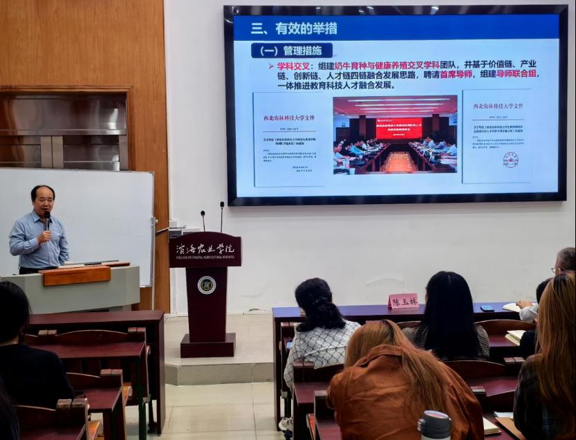 2024年11月8日,西北农林科技大学副校长陈玉林教授应邀莅临我校作关于“产教融合、科教融汇畜牧业”高质量发展学术报告,陈玉林教授针对奶牛与奶羊种业发展及前沿科技创新应用促进畜牧业高质量发展关键问题,以超高产奶牛育种实践为例,介绍了西北农林科技大学畜牧学科研教学团队依托校外科研产业基地,将学科专业建设、科技创新与社会服务相结合,以人才培养项目为载体,开展拔尖型、创新型和复合应用型人才培养改革,推进先进技术应用产业实践,促进畜牧业高质量发展的做法。我校动物科学国家一流专业负责人、williamhill英国院长安立龙教授主持报告会。郑殿峰书记代表滨海农业学院致欢迎词。
