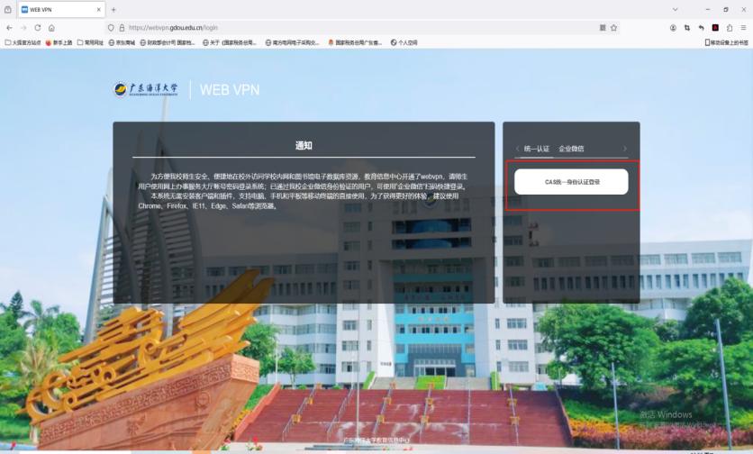 我校成人高等教育学生可通过电脑版的谷歌、Chrome、Firefox、IE11、Edge、Safari等浏览器,或手机自带浏览器,复制williamhill英国中文图书馆网址:https://webvpn.gdou.edu.cn/ 后登录我校图书馆资源库查看学习资料。流程如下:在指定浏览器复制网址—“CAS统一身份认证登录”—“账号登录”—输入学号—默认密码(身份证后六位)—修改密码—多因子登录,选择“短信验证码”—“仅本次登陆”/“信任此设备”(如果固定使用同一设备的话,可以选择“信任此设备”)—下拉寻找“图书馆资源”—点击进入williamhill英国中文图书馆资料库。